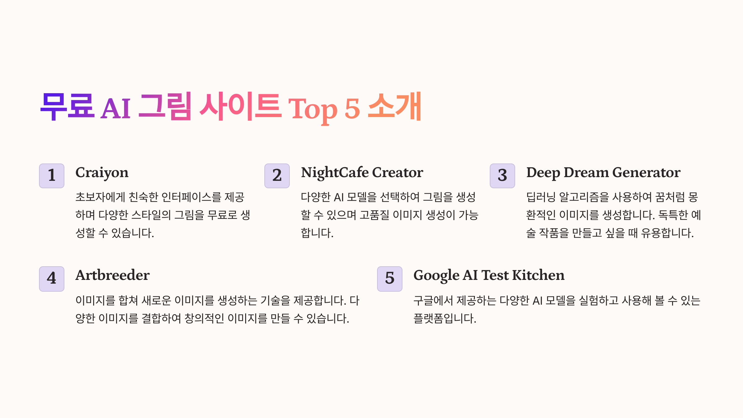 현재 많은 AI 기반 그림 생성 플랫폼이 등장했으며, 그중에서도 무료로 사용할 수 있는 AI 그림 사이트를 소개한다.